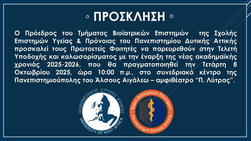 Ο Πρόεδρος του Τμήματος Βιοϊατρικών Επιστημών  της Σχολής Επιστημών Υγείας & Πρόνοιας του Πανεπιστημίου Δ. Αττικής προσκαλεί τους Πρωτοετείς Φοιτητές να παρευρεθούν στην Τελετή Υποδοχής και καλωσορίσματος με την έναρξη της νέας ακαδημαϊκής χρονιάς 2025-2026, που θα πραγματοποιηθεί την Τετάρτη 8 Οκτωβρίου 2025, ώρα 10:00 π.μ., στο συνεδριακό κέντρο της Πανεπιστημιούπολης του Άλσους Αιγάλεω – αμφιθέατρο “Π. Λύτρας”.